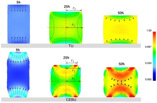 The variation of equivalent strain on the billet symmetry plane during upsetting is shown in Figure 4. At the beginning of upsetting, the strain is mainly concentrated at the billet ends and is radially distributed in CEBU. However, a more uniform strain field is generated in TU due to a higher friction effect on the billet ends. When the reduction ratio reaches 25%, three characteristic deformation zones have been formed in TU, which are the billet end, the billet lateral surface, and the billet center. Correspondingly, two fan-shaped high-strain zones are formed at the billet ends in CEBU. As the reduction progresses, the two fan-shaped strain zones move closer together, resulting in a large compaction effect at the billet center. In contrast to CEBU, two larger rigid deformation zones are generated at the billet ends in TU, which is the reason for the formation of a small and uniform strain field at the billet center. The results indicate that, compared with TU, much smaller rigid deformation zones can be generated in CEBU. In addition, the compression effect at the billet center is much larger in CEBU than in TU.