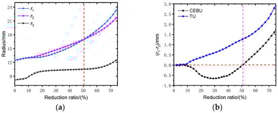 Corresponding to the billet radiuses illustrated in Figure 4, the variation of deformation parameters during upsetting is shown in Figure 5. In CEBU, the radius of the billet end, the cone end bottom, and the billet center are taken as the deformation parameters. As shown in Figure 5a, as the reduction ratio increases, the radius of the billet end is first increased linearly and then changed slightly as the reduction ratio increases from 20% to 51%. This is because most of the load is absorbed by the plastic deformation of the billet cone end when the reduction ratio is below 51%. Accordingly, the radius of the billet cone end bottom is greater than that of the billet center. However, when the reduction ratio is above 51%, the radius of the billet center is inversely larger than that of the billet cone end bottom as the reduction ratio increases. The same value can be achieved for the two radiuses when the reduction ratio is 51%, indicating that bulging has been eliminated. As shown in Figure 4, the difference between r1 and r2 can be treated as a bulging index. The results of the bulging index variation with the reduction ratio in TU and CEBU are proposed in Figure 5b. It clearly shows that the bulging size can increase as the reduction ratio improves in TU. However, in CEBU, the bulging is first formed at the cone end bottom and then at the billet center. In addition, the bulging size in CEBU is smaller than that in TU at the same reduction ratio. Compared with TU, CEBU is not only good at restraining bulging but also has a higher compaction effect at the billet center. Meanwhile, CEBU can eliminate bulging at a reduction ratio of 51%. CEBU shows its superior ability to restrain bulging in the upsetting of LHDR billets.