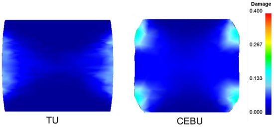 The results of deformation damage after upsetting are shown in Figure 6. It can be seen that the damage in TU tends to occur in the bulging regions. However, in CEBU, the damage is concentrated in the turning area of the cone end, and the magnitude of the damage in CEBU is larger than that in TU. In industrial production, the deformation-damaged parts are usually cut from the billet. This indicates that, compared with TU, CEBU is able to increase the material utilization rate.