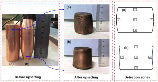 Lots of metal products are manufactured using plastic forming techniques such as forging and extrusion. Forging involves the pressure processing of metal parts with the aim of obtaining a certain shape, size, and mechanical properties. Upsetting is one of the forging methods, which is highlighted by its high efficiency in compacting [1]. Especially in hot forging, upsetting is able to eliminate internal pores at the billet’s center [2,3]. Currently, upsetting is widely used in metalworking to improve the mechanical performance of metal parts. Although upsetting has shown its advantage in metal forming, several obstacles should be handled in practice. Due to uneven metal flow in upsetting, bulging is formed around the billet’s center. In addition, cracks are peculiarly prone to generating on the bulged billet surface [4,5]. Restraint bulging is always a hot topic in the study of upsetting, especially for billets with a large height-to-diameter ratio (LHDR), which is defined by an LHDR value above 2 in this article.