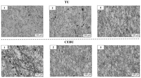 The microstructure in the detection zones of the samples is shown in Figure 8. Using the open-source image processing software ImageJ 1.53v, the average size of the grains in these detection zones can be obtained. For TU, the average grain sizes in the detection zones 1, 2, and 5 were 78.4 μm, 56.2 μm, and 51.6 μm, respectively. In contrast, the average grain sizes of these regions in the CEBU are 62.3 μm, 53.4 μm, and 49.7 μm. The results show that the grain size obtained with CEBU is smaller than that obtained with TU under the same reduction ratio. It is generally accepted that grain size correlates with cumulative plastic strain in metals. Therefore, the grain size results in Figure 8 can indirectly verify the simulation results of the equivalent strain in Figure 4. As discussed in Section 1, due to the friction effect between the billet and the anvil, the metal flow in Zone 1 is restricted. Accordingly, the grain size in zone 1 is generally larger than that in other zones. In relation to the whole billet, the ability of metal flow in CEBU is better than that in TU. As a result, the grain size obtained in CEBU is smaller than that obtained in TU.