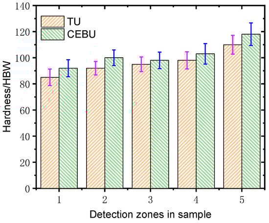 In order to further validate the differences in grain size and mechanical properties between CEBU and TU, microhardness tests were carried out. The hardness results at different detection zones of the specimen are shown in Figure 9. It can clearly be seen that the hardness in CEBU is generally higher than that in the corresponding regions of TU. In addition, the highest hardness value is obtained at the center of the CEBU sample. According to the Hall-Patch theory [29], the hardness of a metal is directly related to its grain size. Therefore, the hardness results in Figure 9 are consistent with the microstructure observations in Figure 8. In conclusion, the grain size and hardness results indicate that the use of CEBU not only suppresses the formation of bulging but also results in smaller grain sizes.