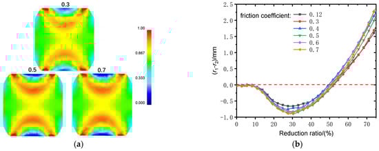 Influence of friction coefficient. (a) Equivalent strain (50% reduction ratio); (b) bulging index.