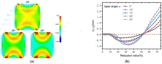 Influence of the taper angle of the cone end. (a) Equivalent strain (50% reduction ratio); (b) bulging index.