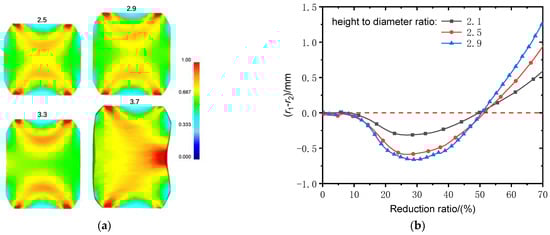 Influence of height-to-diameter ratio. (a) Equivalent strain (50% reduction ratio); (b) bulging index.