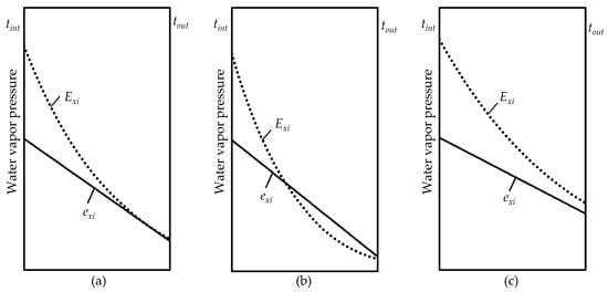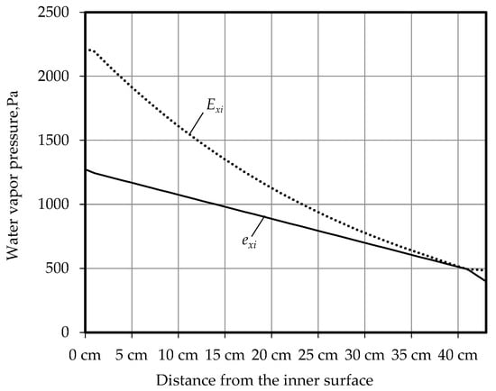 The distribution of the water vapor pressure, at an outdoor temperature of tout = −3.1, equal to the temperature at the beginning of the condensation tb.c., for this outer wall, is presented in Figure 3.