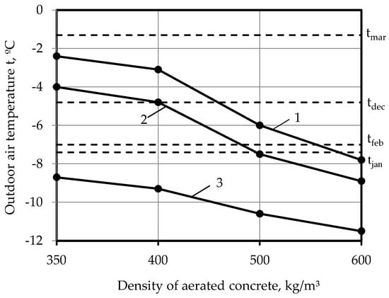 Dependence of the temperature at the beginning of the condensation, tb.c., on the density of the aerated concrete in the city of Voronezh: (1) cement–sand plaster; (2) Knauf GRUNBAND; (3) the developed DBM.