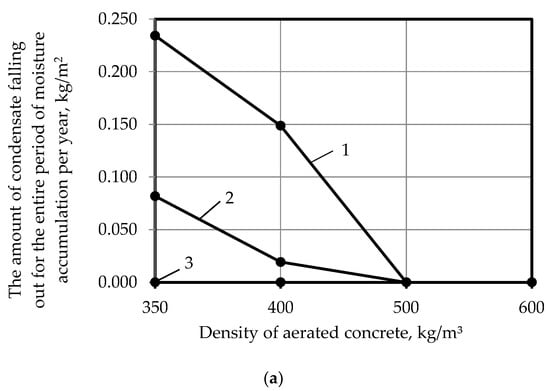 Dependence of the amount of condensate falling out for the entire period of moisture accumulation per year, kg/m2, on the density of the aerated concrete: (a) for the city of Novosibirsk; (b) for the city of Vorkuta; (1) cement–sand plaster; (2) Knauf GRUNBAND; (3) the developed DBM.
