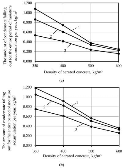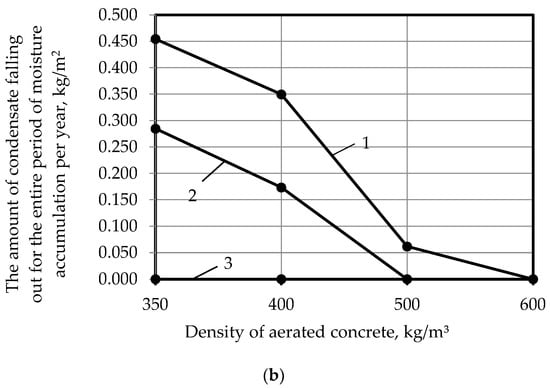 Dependence of the amount of condensate falling out for the entire period of moisture accumulation per year, kg/m2, on the density of the aerated concrete: (a) for the city of Rostov-on-Don; (b) for the city of Voronezh; (1) cement–sand plaster; (2) Knauf GRUNBAND; (3) the developed DBM.