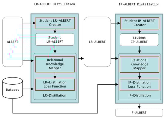 The F-ALBERT Distillation System performs the process of distilling ALBERT into F-ALBERT. The system carries out a two-step distillation process. The first distillation process is the LR-ALBERT Distillation, which distills the ALBERT model into LR-ALBERT. This process consists of two components: Student LR-ALBERT Creator and LR-Distillation. The Student LR-ALBERT Creator generates and initializes the Student LR-ALBERT using ALBERT. LR-Distillation distills the output results of ALBERT for all dataset samples into the Student LR-ALBERT. LR-ALBERT is the result of the first distillation process. LR-ALBERT is structurally identical to ALBERT, but it is a model with fewer layers reused. The second distillation process, IP-ALBERT Distillation, distills LR-ALBERT, which results from the first distillation process, into Student IP-ALBERT. This process consists of two components: Student IP-ALBERT Creator and IP-Distillation. The Student IP-ALBERT Creator creates and initializes the Student IP-ALBERT using LR-ALBERT. IP-Distillation distills the output results of LR-ALBERT for all given data samples into the Student IP-ALBERT. F-ALBERT is the final Student IP-ALBERT model after it goes through the distillation process.