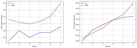 Entropy trend during distillation using the MAE and MSE methods, according to the learning process (Left: Base-size model, Right: Large-size model).