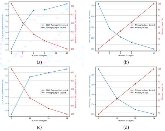 GLUE Average Benchmark scores and Throughput per Second performance according to the number of layer reuses ((a): Base-size model, (c): Large-size model), Fine-Tuning Throughput per Second and Memory Usage according to the number of layer reuses ((b): Base size model, (d): Large size model).