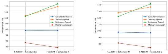 Measurement of F-ALBERT’s computing and GLUE average score performance based on different schedule configurations (left: Base-size model, right: Large-size model).