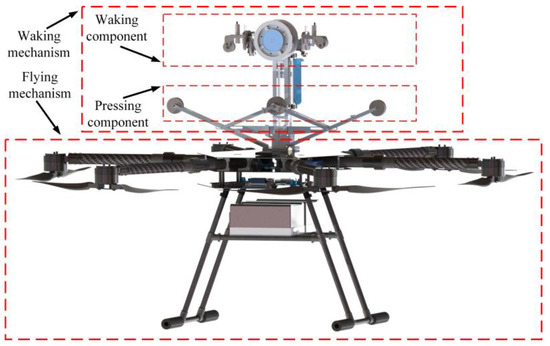 The OPTL inspection tasks include several requirements, such as ensuring that there is no damage to the fittings and power towers, no broken or scattered strands of power lines, and no other attached objects. To meet these requirements, in our study, a 38 kg FPLIR is developed based on a six-rotor system. The overall size of the FPLIR is (length, width, and height). The mechanical structure of the FPLIR consists of two parts, i.e., the flying and walking mechanisms, as shown in Figure 1. The flying mechanism uses the six rotors to generate lift force, land on the power line and fly over obstacles. The propellers are installed under the robot arms, preventing collision with power lines during FPLIR landing. The walking mechanism consists of a walking component and a pressing component. The walking component enables the FPLIR to walk along the power line. The pressing component increases the positive pressure between the driving wheel and the power line to prevent the FPLIR from slipping during the inspection process. The FPLIR needs to use onboard sensors and data processing devices for orientation and navigation to land on the power line. The FPLIR carries an NVIDIA Jetson NX onboard computer, an IMU device, and a Stereolabs ZED2i binocular camera with high resolution and good performance in outdoor environments.