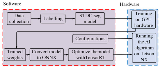 The 1650 images selected were manually labeled using the annotation tool, and the data were augmented (color jitter, random horizontal flip, random crop and random resize) to train the CNN segmentation algorithm. The dataset was divided into 70% training, 15% validation and 15% test sets, and trained using the NVIDIA RTX 3090. Running deep learning algorithms on onboard devices is very computationally expensive and would cause problems for demanding real-time applications. The weights are converted to a frozen ONNX-based model to optimize the model. The frozen graph ensures easy hardware access optimization before generating the optimized engine. The trained weights are optimized using the TensorRT inference library to run a real-time segmentation algorithm. Figure 4 shows the training and testing stages of the segmentation algorithm.