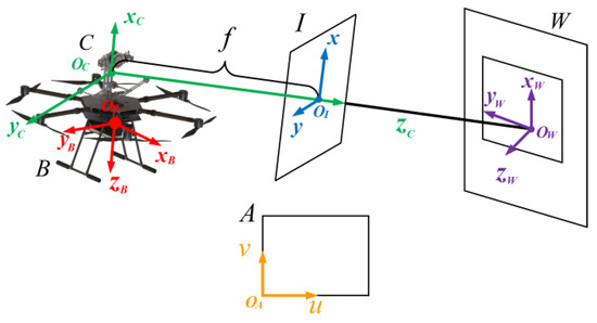 To control the landing of the FPLIR on the power line, its relative position to the target must be calculated. The camera is installed on the walking mechanism of the FPLIR using a rigid connection, and the lens’s direction is the same as the orientation of the FPLIR. Taking the right-handed frame as the reference, the relative position of the frame between the FPLIR and the target is depicted in Figure 5. There are five frames on different levels: A, pixel frame ; I, image frame ; C, camera frame ; W, world frame ; and B, FPLIR body frame .