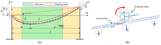 where is the friction, is the component force of gravity for FPLIR along the power line direction. The shape of the power line is catenary due to the effect of gravity. If FPLIR lands on the power line with a large slope resulting in the driving force , it will skid and lose control. The distance between two towers is much greater than the cross-sectional area of the power line. Therefore, the stiffness of the power line has little effect on its shape. The slope of the power line may increase when the FPLIR lands on the power line, so the FPLIR must select a suitable landing area to prevent slipping, as shown in Figure 6a. If the prior structure data of the OPTL can be used to judge the area that satisfies the FPLIR landing conditions, the skidding will be avoided.