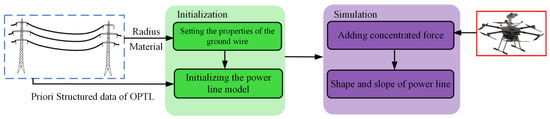 The flowchart of the numerical simulation for the power line model using COMSOL software is shown in Figure 8. By setting the ground material and radius, the initial power line model is generated using the prior structure data of the OPTL. The gravity of the FPLIR is loaded as a concentrated force to the specified slope (or location) to obtain the power line model after the landing of the FPLIR.