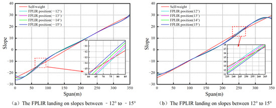 The FPLIR does not slip, and the maximum starting slope of the walking motor is 15°. As an example, the shape of the power line was simulated using the parameters in Table 2, while eight points were analyzed with slopes of −15°, −14°, −13°, −12°, 12°, 13°, 14° and 15°. In this study, a polynomial function is applied to fit the shape of the power line to easily calculate the slope of the power line. The shapes of the power lines before and after the FPLIR landing are fitted using 3rd- and 7th-degree polynomials, respectively. From Table 3, it can be seen that the slope decreases at the landing location. Combined with the variation of the slope in Figure 9, the following conclusions can be drawn. When the slope of the power line is less than zero, the slope decreases at the landing position and its right side; when the slope of the power line is greater than zero, the slope decreases at the landing position and its left side. Therefore, the safe slope for FPLIR landing in the section of the OPTL is −15° to 15°.