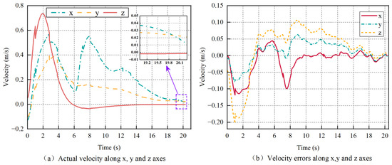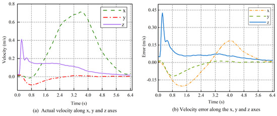 The landing line speed of the FPLIR was limited to reduce the risk during the experiment. As shown in Figure 20a, the speed of the FPLIR changed smoothly and the motion was stable during the landing line. The speed change in the y-axis direction was small due to the small slope of the power line, so the FPLIR hardly needed to adjust its position in the y-axis direction. The smaller speed adjustment in the z-axis direction proved that the combination of the rough and precise landing line strategy was able to achieve the accuracy requirements of landing while consuming less energy. Additionally, according to the data in Table 8, the RMSEs for the actual trajectory and the reference trajectory of the FPLIR in the x-, y- and z-directions were m/s, m/s and m/s, respectively, which demonstrates that it can track the trajectory stably. At the same time, the velocities of the FPLIR at the landing line were m/s, m/s and m/s in the x-, y-, and z-directions, respectively, thus meeting the requirements of the landing line velocity. The above data indicate that the proposed method allows the FPLIR to land on the power line safely and steadily, and the errors in positions and velocities meet the actual requirements.