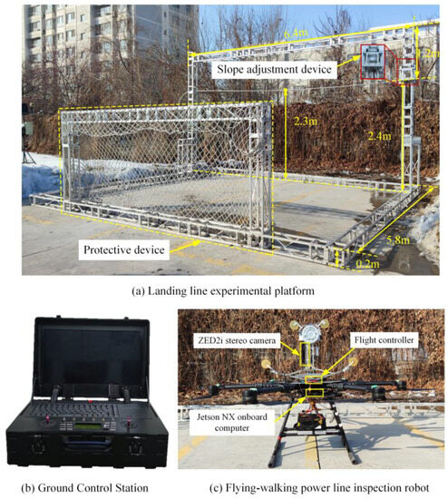 Hybrid robots have been a focus of attention in recent decades, combining the advantages of climbing robots with those of flying robots. They are suitable for long-distance inspections with more flexibility. The flight mechanism can land on power lines and fly over obstacles, while the walking mechanism can walk along the OPTLs [12,13]. The existing landing methods of hybrid robots only allow the robots to approach power lines from the top [12,14,15,16] or the bottom [17,18,19]. However, these hybrid robots are unstable when walking on power lines due to their mechanical structure. In addition, power lines are flexible cable structures with slopes; when hybrid robots land on power lines, they may slip or lose control. As a result, autonomous landing methods for the developed FPLIR should be investigated to ensure safe landing on power lines. This challenge can be broken down into four main issues: (1) identify power lines in the observable space; (2) estimate the status of the robot using the onboard sensors; (3) plan a trajectory that satisfies the dynamic constraints of the robot; (4) track the trajectory under the work conditions [14]. To address these problems, this study proposes a novel landing method for the developed FPLIR based on prior structure data. The main contributions can be outlined as follows: