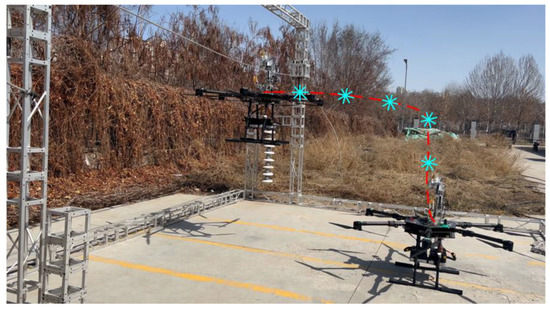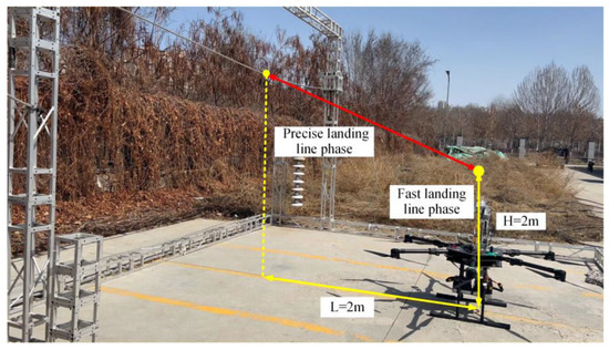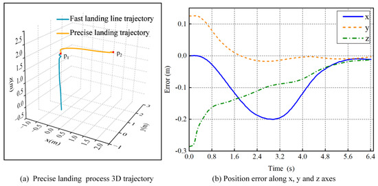 Table 7 lists the root mean square error (RMSE), maximum error, and landing error of position tracking along the x-, y-, and z-axes. It can be seen that the RMSE in all three directions is less than m, and the landing errors are m, m, and m, respectively. Therefore, the FPLIR can achieve good trajectory tracking and meet the position error requirements when landing on the line. Compared with the data in Figure 13, there is an increase in the relative error between the actual trajectory and the reference trajectory due to the positional drift of the VIO.