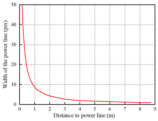 When the distance is greater than 4 m, the depth estimation of the binocular camera fails. The distance between the FPLIR and the power lines can be roughly estimated using the relationship between pixel width and distance in Figure 21. As the FPLIR gradually approaches the power line, the depth estimation becomes more accurate. Therefore, the depth estimation obtained using the binocular camera is valid during the landing line.