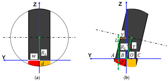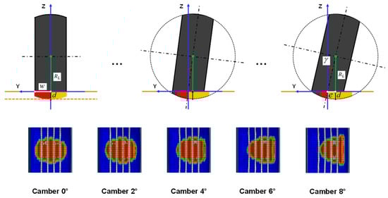The author put forward the tilting method inspired by the geometric relationship between the tire and the road. The intersection of the undeformed tire and the road is used for indicating the tire’s vertical deformation. Deformation without camber angle is shown in Figure 2a. By tilting the tire, Figure 2b shows the deformation change. In Figure 2b, the deformation volume boundaries of two tire parts are perpendicular to the road, because the load is perpendicular to the road.