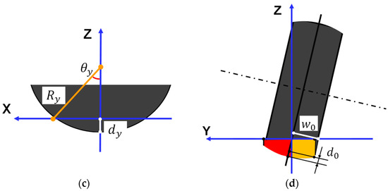 Cross-section diagrammatic drawing of deformation caused by the load. (a) Deformation at zero camber angle. is the contact patch width of each part, is the radial deformation of the tire, is the loaded radius. (b) Deformation at non-zero camber angle γ. is the radial deformation of the cambered tire. is the loaded radius. Points , and are the deformation boundary projections on Y-axis. Point is the rim centre projection on Y-axis. The green dotted line is located away from point . (c) The lateral view of the plane where the green dotted line is located in Figure 2b. and are the radius and vertical deformation of this plane, respectively. is half of the central angle corresponding to the contact length of this plane. (d) The boundary conditions used in the calculations. is half the width of the tire. is the maximum thickness of the tread.