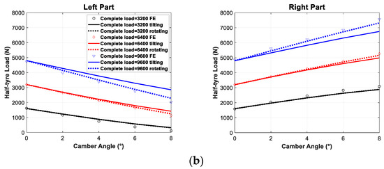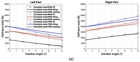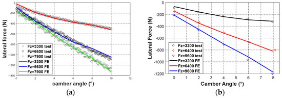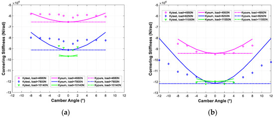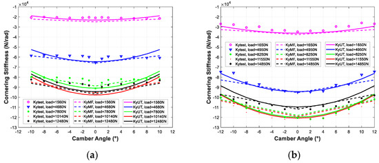 The cornering stiffness dependence of load and camber angle for the UniTire is shown in Formula (31). The variables , , and are model parameters. Figure 11 shows the comparisons.