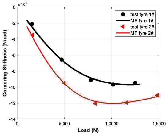 By parameterizing side slip data with different loads through Formula (26), we can obtain and . The parameterizing result is shown in Figure 8. Inputting , , and into Formula (27), we can obtain and . Their sum () is the predicted cornering stiffness.