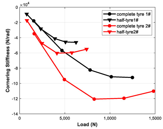where and are the load and cornering stiffness of the whole tire, respectively, while and are the corresponding half-tire results.