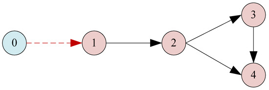 Consider a practical uncertain multi-agent system with unknown control gains as discussed in [43,44], where each follower agent stands for a single-link robot. The communication topology graph of four single-link robots is given in Figure 1, where the leader agent is marked as “0”. The leader agent is used to generate a tracking signal. The dynamics of the single-link robot are described as
