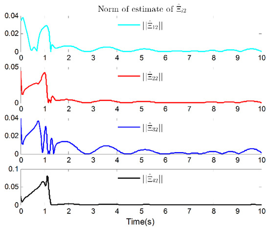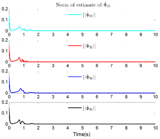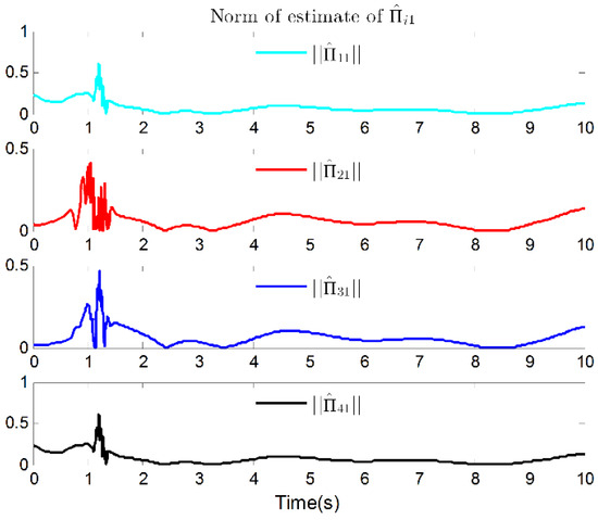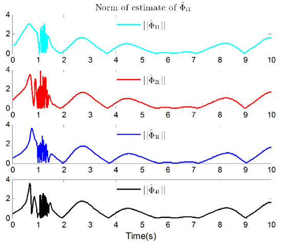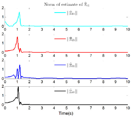 In addition, the curves for adaptive laws , , , , and are shown in Figure 6, Figure 7, Figure 8, Figure 9 and Figure 10 respectively. From these figures, we can find that all signals of the closed-loop system are bounded after a finite time. Further, in view of the results in Figure 2, Figure 3, Figure 4, Figure 5, Figure 6, Figure 7, Figure 8, Figure 9 and Figure 10, we can deduce that the finite-time control law and adaptive laws designed in this paper can make the nonlinear multi-agent systems SGPFS. This also illustrates the correctness of the theoretical analysis results from another perspective.