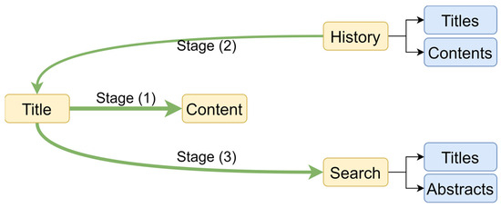 Inspired by [7], we propose the MiBeMC model to better mimic human behavior in evaluating media credibility on the internet. In creating MiBeMC, we acted from the belief that information modules typically have high affinity and mutual support, which is consistent with previous research on modal similarity or consistency [8,9]. Figure 1 shows human evaluation media credibility stages on the internet, consisting of multiple components with a news example with two components, i.e., title and body content. The evaluation behavior can be divided into three stages: (1) reading the title and content on a page on a website; (2) after the readers pay attention to the news outlet, they will associate the credibility of the same outlet’s news with what they have seen before; and (3) the human user will search for other news on relevant information based on the title. In stage (1), readers generally conduct a preliminary evaluation of the credibility of the information published by the media based on the title and content. In stage (2), readers generally further evaluate the credibility of the media outlet based on historical articles. In stage (3), readers generally search for relevant topic information and complete their final evaluation of media information based on relevant titles and content. After experiencing multiple factual verification processes of unified media release information, readers often make the final judgment on the credibility of the media. Thus, the media credibility verification behavior of readers can be described as proceeding from information to historical information to relevant information––i.e., title, content, historical information, similar information (as shown in Figure 2).