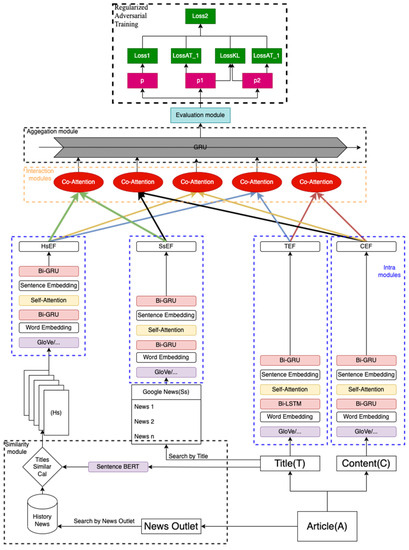 This module simulates the reading and understanding process of humans, including five interaction modules within four intra features. As shown in Figure 1, different news articles on the internet can complement and verify each other, which is also one of the bases that humans use to distinguish fake news and low credibility news outlets more effectively [29,30]. In addition, research has shown that mining information from two different components is effective [31,32]. Therefore, replicating the human reading and understanding process of news content components, we can combine these two different components and then use feature extractors between the components to separately mine the interaction affinity of each combination.