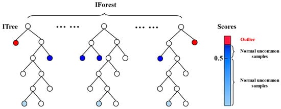 - Outlier detection. There are many ways to detect data outliers. Common methods include 3σ criterion (Lajda criterion) distribution and box plots. The 3σ criterion distribution [12] is a method based on the calculation of the standard deviation, which results in limited processing of the data collected at the blast furnace site, because the data must satisfy a normal distribution. A box plot [13] is essentially a statistical graph used to show the dispersion of data, but it may not provide an accurate assessment of the skewness and tail weight of the data distribution. In addition, for datasets that contain relatively large batches of data, box plots reflect more ambiguous information. Therefore, in this study, an isolated forest algorithm was utilized for detecting anomalies in the blast furnace site data. Isolated forest [14] is a nonparametric machine-learning method that does not require a specific mathematical model to model or label anomalous data, allowing for unsupervised anomaly detection. Its schematic structure is shown in Figure 1.
