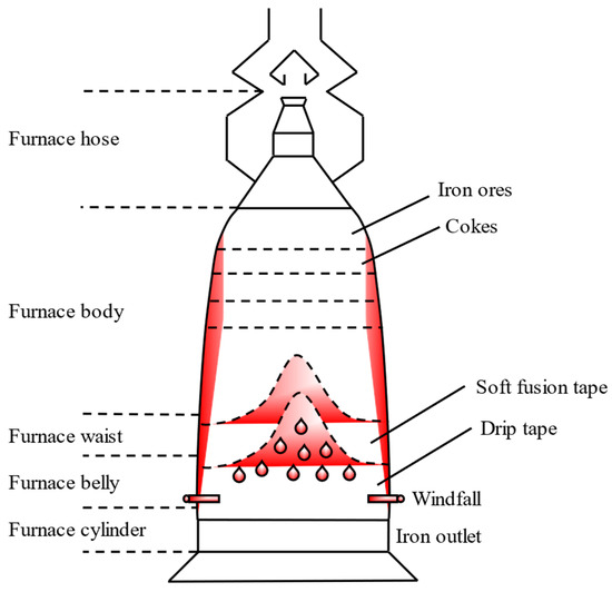 Blast furnace air permeability is related to the quality of the downstream situation of the blast furnace, as well as the blast furnace smelting strength, energy consumption, and iron quality, is the most critical parameter in the blast furnace, which is determined by the blast furnace smelting process. The blast furnace is a tall, large, and enclosed reactor. It is called a “black box”, because its internal closed smelting environment cannot be observed [15]. Its structure is shown in Figure 2.