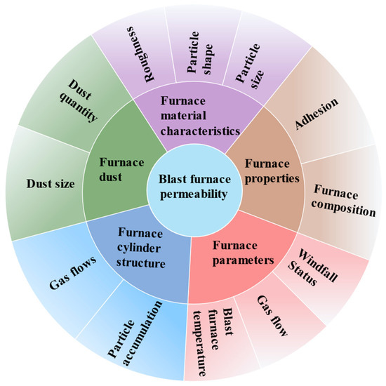 Blast furnace permeability denotes the ability of gas to flow within the furnace. It is influenced by various factors, including pore space size, connectivity, and resistance to gas flow within the particle accumulation present in the blast furnace. The formation mechanism of blast furnace permeability is related to the following factors, as shown in Figure 3 [17,18,19]: