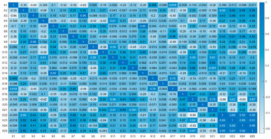 Spearman correlation analysis [24] discriminates the strength of the correlation by the Spearman rank correlation coefficient; hence, it is also called the Spearman rank correlation coefficient. The principle is to analyze the nonlinear data of 25 critical parameters affecting blast furnace production by solving the ranking position of the original data, ranking the critical parameters () by the magnitude of the values and establishing the order table, respectively. The position of the order table is called rank order, and the Spearman rank correlation coefficient is calculated as shown in Equation (5):