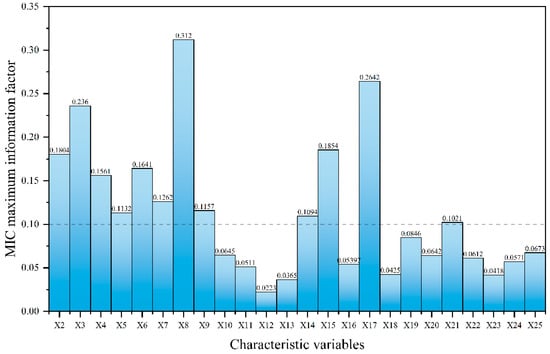 MIC maximum information coefficient analysis [25] is one of the methods to indicate the strength of nonlinear relationships between parameters and is built on the machine-learning concept of feature selection. The larger the MIC, the stronger the association between parameters. The collected data set of 25 critical parameters affecting blast furnace production is analyzed for the MIC, and the blast furnace permeability index is analyzed for the MIC with other critical parameters. Twelve critical parameters () with MIC coefficients greater than 0.1 were selected, as shown in Figure 6. The specific concept involves selecting a data set consisting of two crucial parameters that are distributed within a two-dimensional space. To analyze this data, an grid is employed to partition the data space and calculate the mutual information of the random variables x and y. The MIC analysis is calculated as shown in Equation (6):