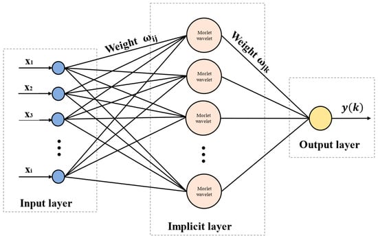 where: is the input value of the wavelet neural network; is the predicted output value of the wavelet neural network; is the output value of the th node in the hidden layer; is the wavelet basis function; is the weight of the input layer to the hidden layer; is the scaling factor of the wavelet basis function; and is the translation factor of the wavelet basis function.