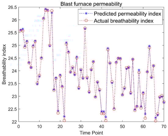 This wavelet neural network blast furnace permeability index prediction model was put into the actual production of a #2 blast furnace in a steel enterprise. The data set of key parameters in a certain time period was collected, the data of the required characteristic parameters were selected for blast furnace permeability index prediction, and the predicted values were compared to the actual production values, as illustrated in Figure 11.