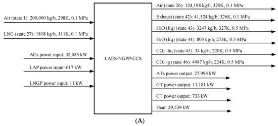The sketch of the proposed system, which comprises an LAES unit, an NG power plant, and a CO2 capture unit, is depicted in Figure 1. A Linde–Hampson liquefaction cycle is adopted for the air liquefaction. The present study does not discuss the purification and pre-treatment of the feed gas, LNG transmission, and storage processes [20]. In the proposed arrangement, methanol and propane are exploited to recycle the cryogenic energy of the LA in the discharging period, to pre-cool the compressed air in the charging process. To explore the overall performance of the proposed complex system, assume that the compressors and turbines are operating at a steady state. A brief schematic is provided in Figure 1A to indicate the temperature, pressure, heat, and power of all the inlets and exits.