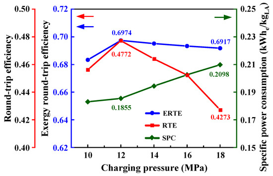 The results show that the charging pressure of 12 MPa can be an optimal condition with ideal technical and economic performance. When the charging pressure is set to 12 MPa, the RTE, ERTE, LCOE, and net output power of the system reach their maximum values (47.72%, 69.74%, 0.0965 USD·kWh−1, and 27,369 kW, respectively), and the SPC is 0.1855 kWhe·kgLA−1. Although the investment costs for the components (USD 28.44 million) and materials (USD 2.55 million) are high, it takes only 5.73 years to recoup the invested capital, with an expected net return of USD 55.81 million over 20 years. The detailed stream parameters (i.e., T, p, m) are included in Appendix A, Table A2.