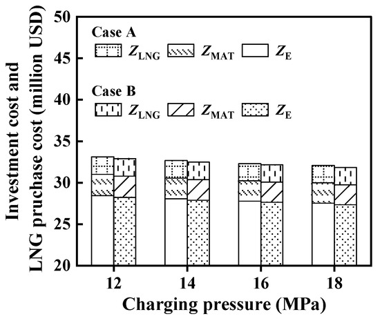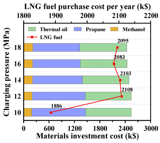 Effect of charging pressure on materials investment cost and LNG purchase cost.