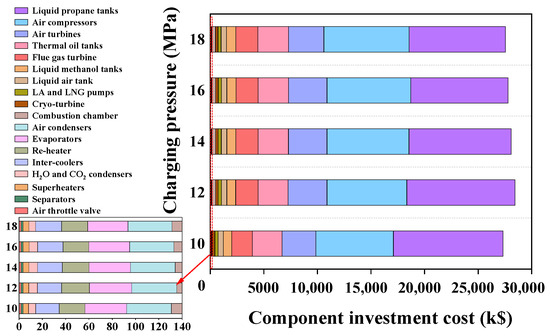 Figure 3 shows the materials investment cost and LNG fuel purchase cost per year. Figure 4 shows the investment in the equipment. The initial investment cost is USD 29.88–30.99 million, and the investment cost in the LPTs (USD 8.98–10.25 million), the ACs, ATs, and LOTs accounts for the main part of the . Capital investment in the materials accounts for at most 8.5% of the total capital expenditure. As the charging pressure increases, the compression power consumption and the compression heat increase, resulting in higher investment costs for the ACs and thermal oil. The liquefaction temperature of the compressed air also increases with rising charging pressure, decreasing the cold energy requirement for the air condensation process, and reducing the investment costs in propane and the LPTs.