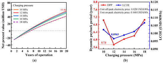 Effect of charging pressure on the economic indicators, (a) NPV and (b) DPP and LCOE.