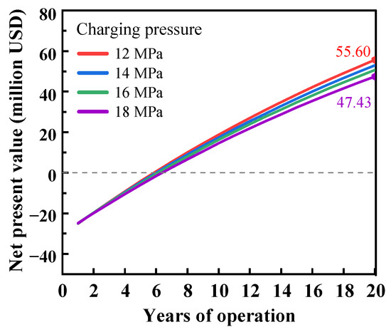 Figure 5a shows that the NPV increases, as time goes by, during the life span of the system. The maximum NPV of USD 55.81 million and the minimum NPV of USD 40.98 million occur at the charging pressures of 12 MPa and 18 MPa, respectively. Therefore, it is indicated that the optimal lifetime economic benefits of the project occur with a charging pressure of 12 MPa. When operating at a charging pressure of 10 MPa, the NPV of the system is USD 41.09 million, which is USD 109 thousand higher than the NPV at 18 MPa. This is due to the similar total annual profit for the two different conditions (USD 4,770,187 at 10 MPa and USD 4,769,784 at 18 MPa).