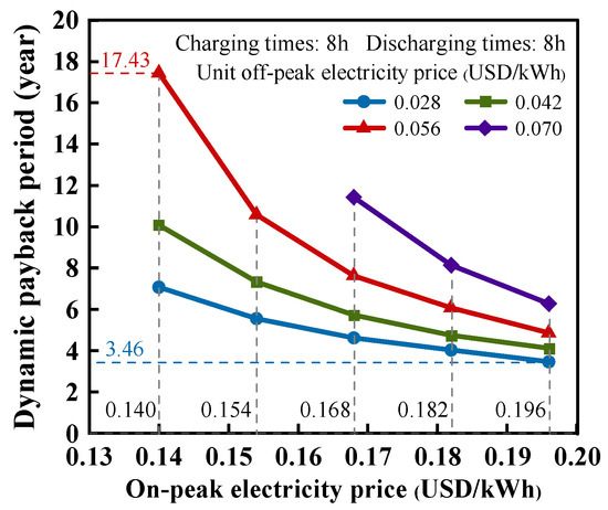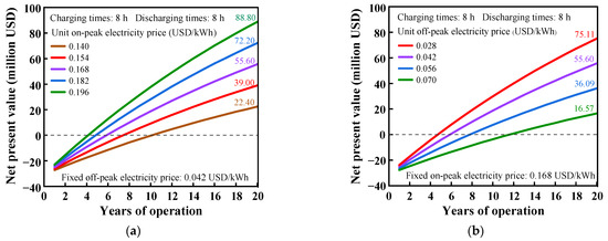 Both the DPP and LCOE show a decreasing trend before increasing with the rising charging pressure, according to Figure 5b. When increasing the charging pressure to 12–16 MPa, the DPP can be shortened to 5.73–6.20 years. The LCOE with the charging pressure of 12 MPa is 0.0965 USD·kWh−1, which is 0.0101 USD·kWh−1 less than that with the charging pressure of 18 MPa. It is because the largest net output power of the system occurs at the charging pressure of 12 MPa (see Table 5), allowing the system to generate the highest total annual revenue.